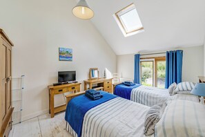La première chambre abrite un grand lit king-size en chêne avec des meubles assortis, tandis que la seconde dispose de lits jumeaux et de couettes doubles pour plus de confort.