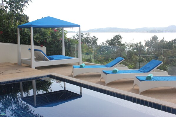 Cette terrasse face à l'est à travers la baie de Bang Rak et bénéficie du soleil du matin. Transats sont disponibles pour «adorateurs du soleil» et un sala couverte seront accueillis par ceux qui veulent se détendre à l'ombre. La piscine elle-même est une joie absolue.