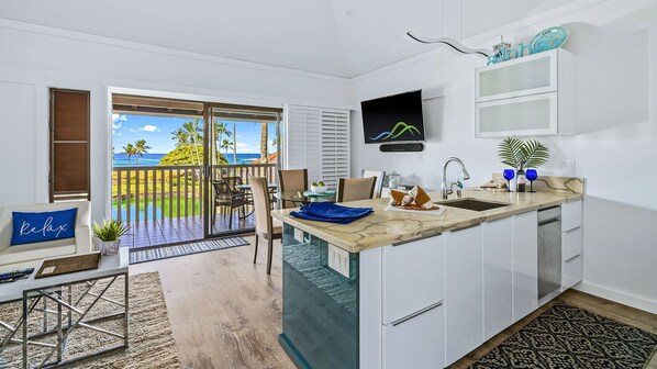 This newly remodeled condo is beautiful and spotless, and the view is amazing. It is very quiet and peaceful at Kiahuna Plantation, yet just a 3 minute walk to Poipu Beach from our condo. We will definitely return here next year! Thank you Brendan!