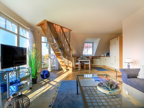 Vous vous détendrez dans un magnifique appartement de 2 pièces d'environ 56 mètres carrés, situé au deuxième étage et doté d'une grande terrasse sur le toit, d'où vous pourrez voir la mer Baltique. L'appartement se prolonge sur deux étages. Sous l'écran sont le salon avec canapé, salle à manger et cuisine intégrée (cuisinière avec four, lave-vaisselle, machine à café). Inclure aussi stéréo et TV installations. Dans la zone de vie est atteint par un escalier dans la petite galerie où vous pouvez vous retirer pour lire et se détendre. Il est également à la maison de l'accès à la terrasse sur le toit. Au bas de la complète une chambre double et une salle de bains avec baignoire et WC, l'image globale de cet appartement. Par personne vous avez un paquet de linge comme équipement d'origine disponible. Appartement non-fumeur! Une place de parking disponible.