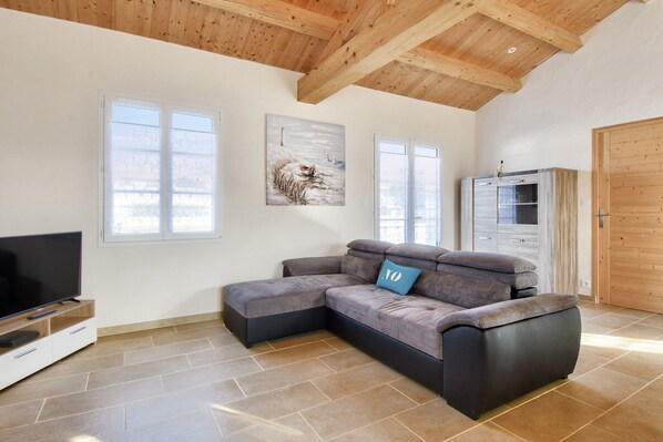 Entrez dans le logement et découvrez une belle pièce de vie avec un salon disposant d'un canapé confortable, une télévision, un poêle à granules (avec granulés à disposition) idéal pour les soirées plus fraîches, et d'un espace salle à manger avec une belle table pouvant accueillir 8 personnes. Une cuisine ouverte se trouve juste à côté et est entièrement équipée, parfaite pour les repas en famille. Elle est dotée d'équipements modernes : un réfrigérateur-congélateur, une plaque induction, un four, un micro-ondes, un lave-vaisselle, une machine à café filtre, une bouilloire et un grille-pain et vous permettra de concocter de délicieux repas.