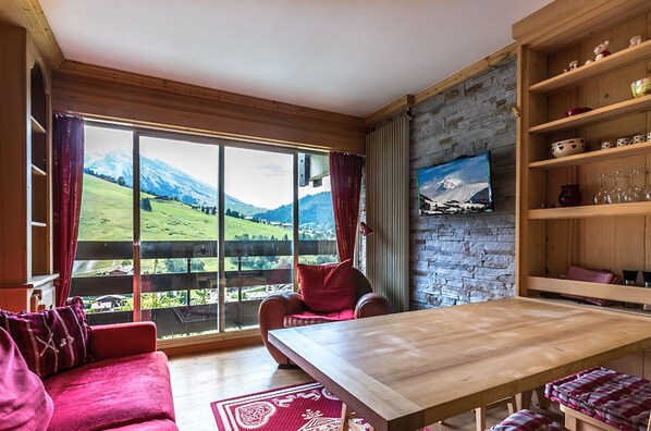 - Séjour (18.66 m²) : canapé-rapido convertible 2 pers(140) Couettes, TELEVISEUR, baie vitrée sud avec vue montagne.
