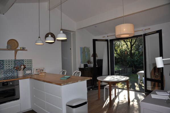 La maison offre un espace de vie agréable et fonctionnel. Le séjour se compose d’un coin repas avec table et chaises, de buffets de rangement, d’un canapé, d’une table basse et d’une télévision, créant une ambiance conviviale pour les vacances. La cuisine ouverte sur le séjour, avec son comptoir, est entièrement équipée pour un séjour en toute autonomie, avec plaques vitrocéramiques, réfrigérateur avec congélateur, combiné four et micro-ondes, lave-vaisselle, rangements, vaisselle et ustensiles de cuisine.