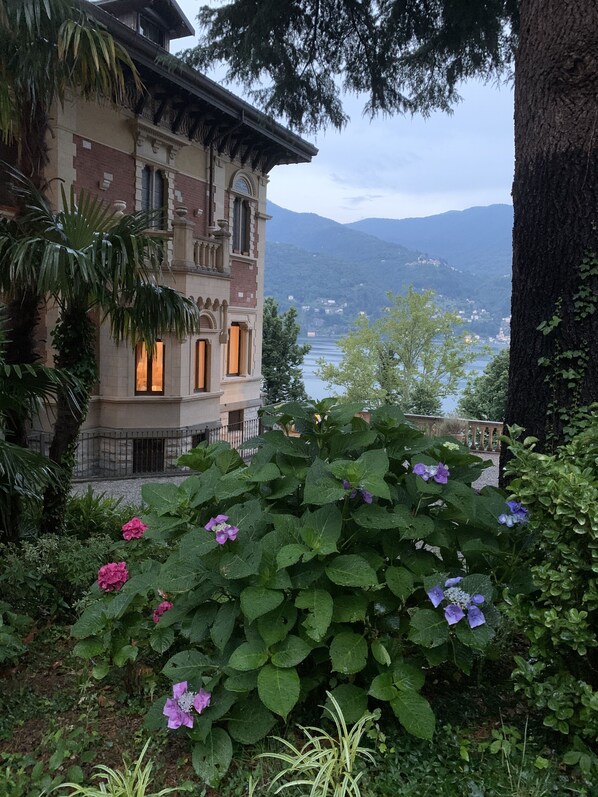 Villa Castiglioni est le nom original de cette fantastique villa historique qui a été construite par un célèbre architecte italien E. Sommaruga en 1900. Maintenant magnifiquement restaurée, cette perle architecturale s'élève sur 3 étages au sommet d'une colline surplombant le lac de Côme. La Villa Castiglioni est située entre le complexe cinq étoiles Villa D'Este et la Villa Oleandra appartenant à la star hollywoodienne George Clooney. La propriété locative occupe tout le rez-de-chaussée supérieur (220 m²) avec 2 chambres à coucher (lit queen size + 2 lits jumeaux qui peuvent être réunis, lits extra longs), 2 spacios et salles de bain somptueuses, une avec un hot tub Teuco et la seconde avec une douche à jets puissants Teuco, un salon-salle à manger de 80 m² et une cuisine entièrement équipée. Il y a 2 autres canapés dans le salon. L'ensemble de la propriété est climatisé sauf la chambre 2d qui a un accès direct à la terrasse et est équipée d'un ventilateur de dernière génération. La troisième chambre a 2 lits jumeaux, la salle de bain 3d est spacieuse et avec une lumière naturelle et est située dans l'appartement du rez-de-chaussée, où vous trouverez également un espace TV / fitness, avec équipement TECNOGYM, blanchisserie / repassage. L'appartement au rez-de-chaussée est très privé et confortable mais pas aussi luxueux que l'appartement principal. La décoration intérieure de cette propriété a été réalisée par un studio renommé de Milan. L'extérieur dispose d'une terrasse panoramique pour les repas en plein air avec une table chrétienne pour 8, un jardin privé avec un bain à remous pour 4, chaises longues et parasol. L'ensemble de la propriété dispose d'un accès privé depuis un jardin bien entretenu face au LAC DE COME. Wifi, TV satellite, parking sur place sont également disponibles sans frais supplémentaires. La villa est située au sommet d'une colline avec une vue panoramique spectaculaire sur le lac de Côme et les collines environnantes. La distance de Côme est de 15 km, de Milan- 65 km, de Lugano (Suisse) - 45 km. Dans le quartier il y a beaucoup de très bons restaurants, bars et magasins. Les courts de tennis et le golf corse sont situés à une courte distance, une station de bateau et un arrêt de bus sont également à une distance de marche de la propriété. La villa est située au sommet d'une colline à 100 mètres de la rive du lac. La plage publique la plus proche est accessible à pied. Il y a aussi des sentiers pédestres avec des vues panoramiques à couper le souffle, juste en face de la porte de la villa.