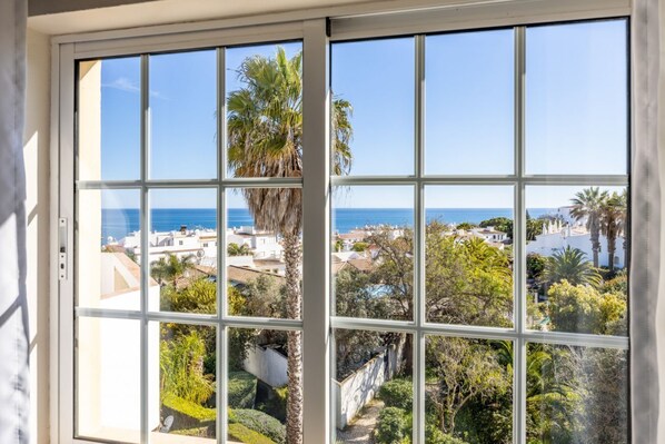 Chambre à coucher avec 2 lits simples et armoire équipée. Fenêtre donnant sur les jardins et la mer au-delà.