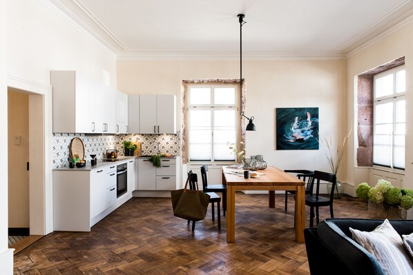 Living in the city palace, spacious 4-person apartment with wood-burning stove