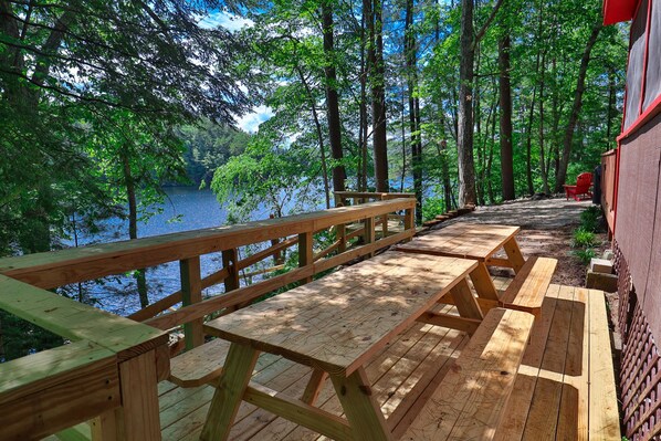 Step outside and take in the endless lake views on the 8X16 outdoor deck where you will find a BBQ for all your outdoor cooking needs as well as an enclosed outdoor shower. Just off of the deck, take a walk down the staircase to a private dock where you can enjoy endless swimming, two kayaks, one paddleboard, one canoe, lake access, and all the fresh, Adirondack air your lungs can handle! In the evening get your smores and gather the kids around the fire pit as you watch the sunset on a perfect day.