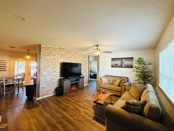 All rooms have TVs and fresh flooring. Our kitchen is ready for gatherings with a movable table seating eight. Outside, enjoy the patio with a comfy couch, outdoor table, and a cozy fire pit area with plenty of seating. You’ll have all the comforts of home and a little lakeside charm. Enjoy your stay!