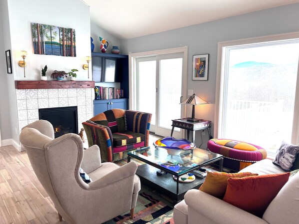 Step inside, and you are immediately captivated by the breathtaking open floor plan, where the kitchen, living, and dining areas flow seamlessly beneath soaring cathedral ceilings. Walls of glass invite the outdoors in, flooding the space with natural light and framing panoramic views of the Mount Greylock Reservation—a tableau of grandeur and serenity.