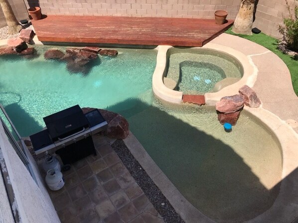 There is a Large private pool in the backyard enjoy relaxing in the pool during the day and the spa after a long night out. Your place is only about a 15 min drive to the strip or airport. Also near by is a gas and liquor store it is about a 1 mile away. Heating pool is additional $100 a night