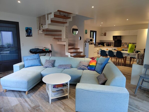 Notre maison est neuve. Elle est située au milieu des pins, entre une allée piétonne et cyclable boisée et une rue peu passante. Elle dispose de tout le confort d'un maison moderne et d'une terrasse sud et une terrasse nord arborée pour profiter au maximum de la vie au grand air, soit au soleil, soit à l'ombre. Elle comprend une petit studio séparé du batiment principal pour les amateurs de tranquillité. Le centre-ville de Grand Village, à 5 min à pied, dispose d'un supermarché, de bars et restaurants. En bordure de forêt, le village est desservi par les pistes cyclables. La magnifique et longue plage de la Giraudière est à 10 min en vélo.