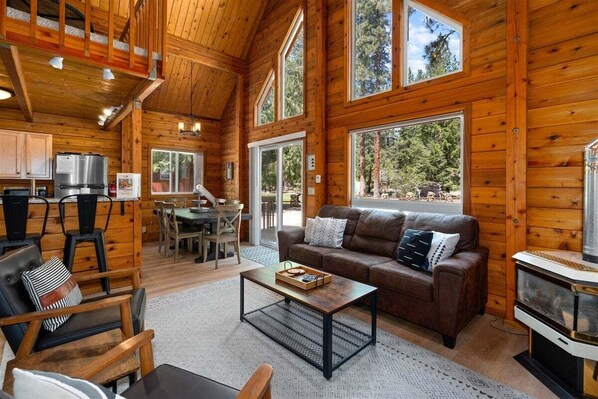 Once inside, snuggle into the cozy sofa with a bowl of popcorn, a tasty beverage, and a few friends and let the good times roll. If you're the chef in the group you can join the fun without having to leave the kitchen as the open-concept main floor allows for sightlines in every direction. When the shindig slows down and you become ready for some true relaxation you can take your pick between the well-appointed queen bedroom on the main level or for the true cabin experience climb the stairs to the charming loft where you will find 2 more queen beds. The full bathroom is conveniently located right down the hall from the main area and just past that is a laundry room to clean up after a day of adventures in the woods!