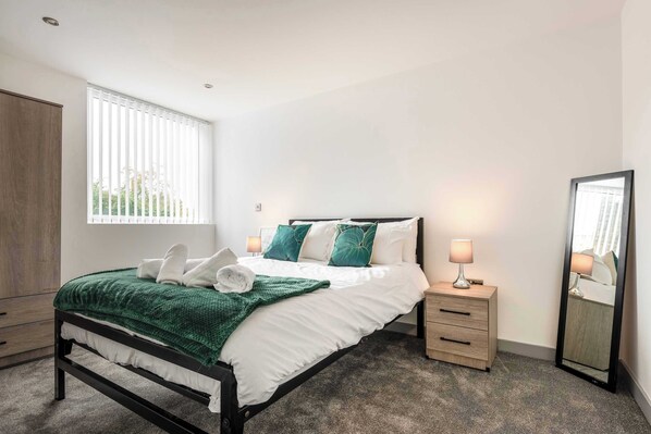 The apartment combines modern comfort with practicality, making it a great base for work or leisure. The open-plan living area includes a sofa, dining table, smart TV, and a fully equipped kitchen with appliances and cookware for home cooking. High-speed broadband runs throughout the property. The double bedroom offers a comfortable bed dressed in crisp hotel-quality linen and plenty of storage space. The bathroom features a large shower, toilet, and sink, with complimentary toiletries and fluffy towels provided. Free parking is available on-site for added convenience.