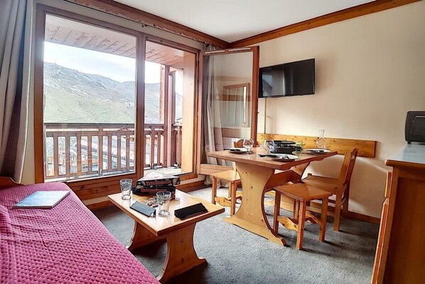 Pied des pistes de ski, 4ème étage, vue montagne, balcon, télévision, casier à ski, 26m²