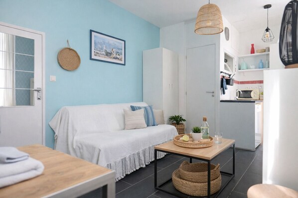 À seulement 20 mètres de la grande plage, ce studio est parfait pour profiter des vacances en bord de mer, à proximité de toutes les commodités.