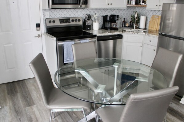 🍽️ KITCHEN & DINING • Appliances: full-size fridge, oven, stove, microwave • Coffee maker plus starter pantry items (spices, cooking oil, etc.) • Cookware, utensils, dishes, and glassware included • Dining table for two that easily doubles as a laptop-friendly workspace