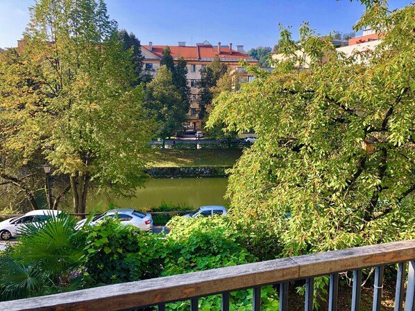 Ljubljana centre, river view, balcony & bikes
