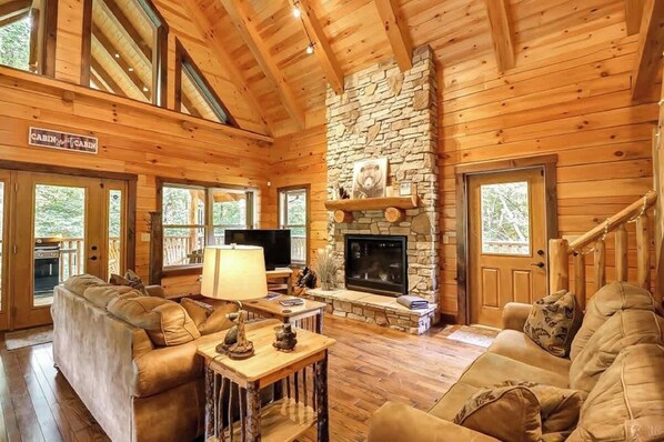 La grande salle à couper le souffle et romantique offre une cheminée en pierre, un haut plafond de 22-1 / 2 avec un poteau central taillé à la main, des canapés en cuir, une télévision par satellite et des planchers en bois de chêne massif.
