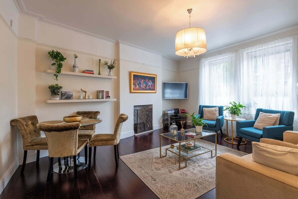 Living Room: The heart of the home, this beautifully styled living room invites you to relax in comfort and style. A soft beige sofa and two bold blue armchairs add warmth and personality, while large sash windows flood the space with natural light. Evenings are cosy by the gas fireplace, surrounded by books, plants, and thoughtful artwork. After a day out, you can unwind by streaming your favourite shows on the smart TV. Just beside the seating area, a round dining table with plush velvet chairs offers an inviting spot for enjoying meals or evening chats.