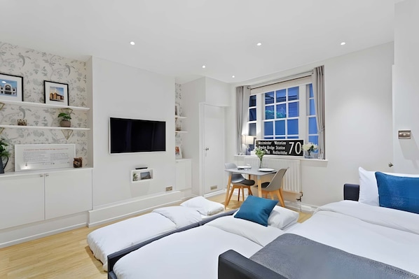 The spacious open-plan living area is designed for both relaxation and entertaining. Featuring wooden floors, high ceilings, and warm décor, the room feels bright and welcoming. Unwind on the plush sofa with the flat-screen TV or enjoy a meal at the dining table. For families or small groups, the space includes an additional bed and a travel cot, providing a versatile central London base without compromising on comfort.