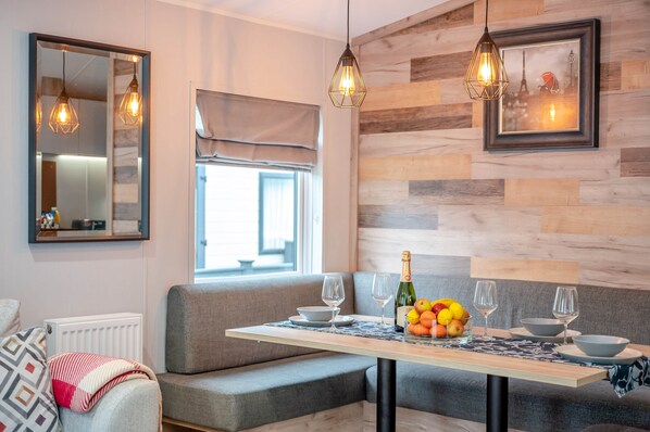 Near to the kitchen is a cosy dining area corner, complete with contrast wood panelling and upholstered seating, and accommodating four diners comfortably around a simple table.