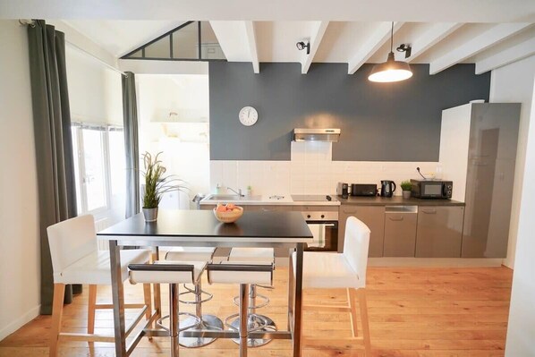 Duplex rénové, dans un quartier calme. Il se compose d'une chambre avec lit doubles et penderie, une salle de bain avec douche et meuble de rangement, une belle pièce de vie lumineuse avec deux canapé-lit et cuisine ouverte toute équipée (four, micro-onde, bouilloire, Nespresso, réfrigérateur, vaisselle)
