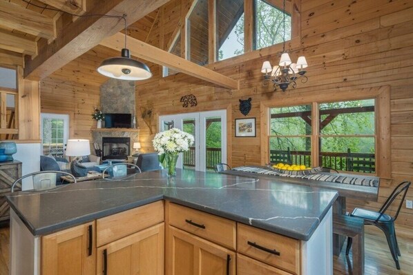 Once inside, you’ll appreciate the large open living space complete with stone gas log fireplace, massive accent beams, custom tongue and groove cathedral ceilings and a wall of almost floor to ceiling windows. The open kitchen features the clean look of quartz counter tops and stainless-steel appliances. See yourself seated around the adjacent dining room, enjoying a family meal or fun filled evening of board games or cards. The master bedroom and master bath are located on the main floor as well, with the master bath connecting to the main living area. Wide stairs lead to the large open loft overlooking the main living area and includes two twin beds for additional sleeping space. A queen bed and second full bath are located in the lower level sleeping area as well. A family TV room is also located there. This property comes equipped with washer/dryer, central heat and A/C, Wifi, Apple and Smart TV with loads of apps, Spectrum cable, gas fireplace, hot tub, firepit, and charcoal grill.