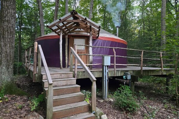 The Yurt is located on a shared piece of land, but your stay is tucked in a private wooded area. The Yurt is heated by a wood-burning stove, and is a wonderful stay year-round.