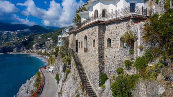 You can reach the apartment from the parking space along the coast road, climbing a staircase of about 50 lava stone steps from Vesuvius. Going up, the view of the coast gradually opens up to the left in one of the most panoramic points, which allows you to see the stretch from Maiori to Conca dei Marini. On the left the stone wall recalls the structure of the sixteenth century tower located lower, facing the sea.