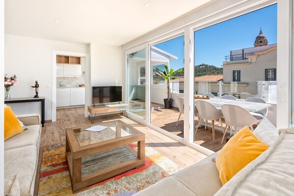 Le salon dispose d'un espace de détente spacieux avec un canapé deux places et une grande fenêtre donnant accès à une terrasse ensoleillée équipée de mobilier de salle à manger en plein air et d'un élégant salon avec des canapés d'extérieur. À côté, vous trouverez une cuisine parfaitement intégrée et entièrement équipée pour répondre à vos besoins, ainsi que l'accès aux trois chambres, toutes équipées de lits simples.