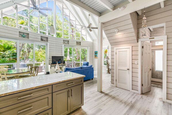 After a day spent boating or deep-sea fishing, come home to a beautiful front deck where you can sit down to a late-afternoon lunch or evening cocktails with dinner. Inside, you'll find a freshly renovated living space with soaring ceilings and a wall of windows that seem to erase the boundary between indoors and out. It's a lovely, atrium-like setting whether you're cooking in the quartz kitchen with stainless steel appliances, dining at the breakfast bar or the circular table, or gathering with loved ones to stream a movie after dinner.