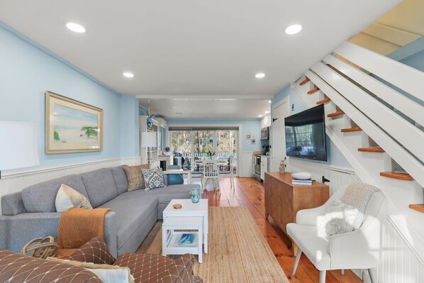 First floor living room, with dine-in kitchen, and newly renovated 1/2 bath. Open interior, cozy coastal decor, 52" flatscreen Smart TV, dining table, desk, board games and books to enjoy. Outdoor brick patios both front and back.