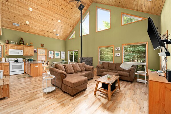 - Nicely stocked kitchen, breakfast bar and expandable table to have a cabin cooked meal or do a monumental puzzle