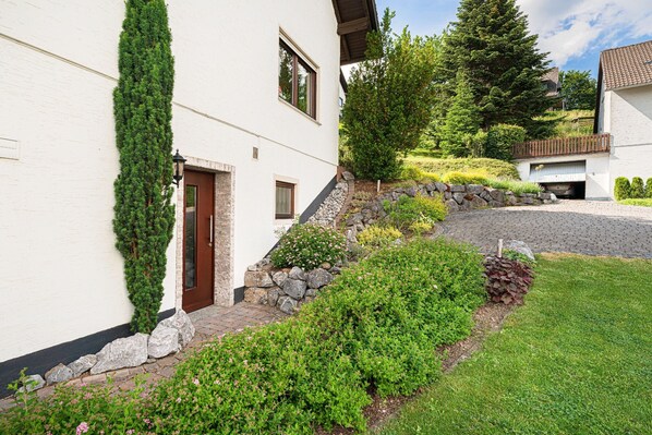 Our lovingly furnished vacation apartments are situated on a fantastic south-facing slope at the foot of the Pön with its 745 meters of altitude. Nature, mountain bike and hiking enthusiasts will find ideal conditions here. You can start your tours directly from the house into the beautiful landscape. The village of Düdinghausen is centrally located between Winterberg and Willingen with their attractive leisure facilities. Winter sports enthusiasts can also enjoy themselves there, whether tobogganing, alpine or classic cross-country skiing. Other excursion destinations in summer are the Diemelsee, Edersee or the Hillebachsee with its water ski facility. Parking is available for our guests directly at the house. Lockable storage facilities for bicycles are available. WLAN can also be used free of charge. Pets are only allowed in the Garden apartment on request (extra charge).