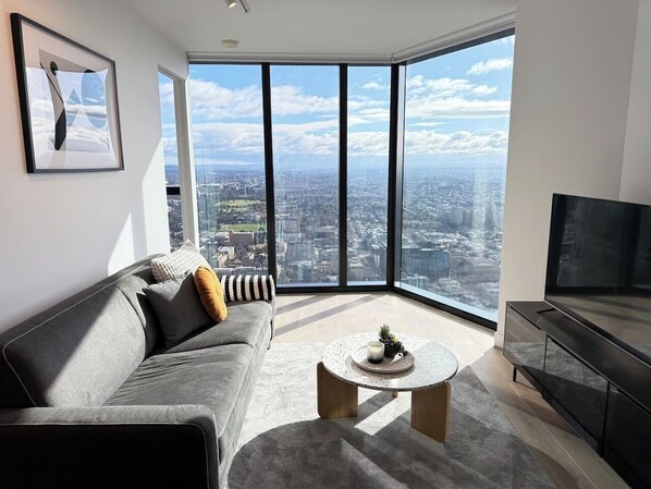 This modern 2-bedroom, 2-bathroom apartment showcases uninterrupted Melbourne skyline views through floor-to-ceiling windows. Positioned on Victoria Street, you’ll be steps from Queen Victoria Market, in the free tram zone, and a short stroll to Carlton’s famous Lygon Street dining and the CBD. Designed for comfort, it includes a full kitchen, laundry, smart TV, and central air — perfect for couples, families, or business travellers.