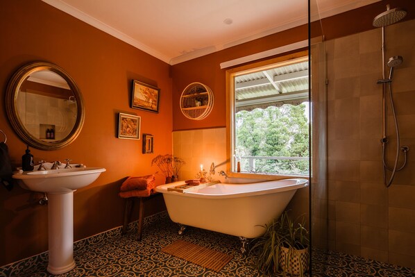 The large bathroom has a clawfoot bath that looks out over the beautiful views and into the trees. Luxuriate in the walk-in shower with supplied Warbotanicals body wash.