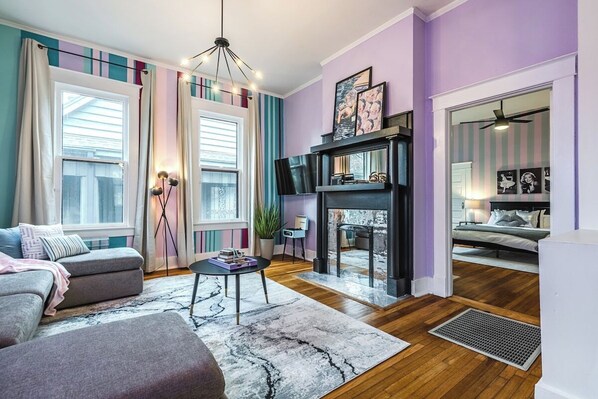 ☆☆ LIVING ROOM ☆☆ As you walk into the home, you will be greeted with a cozy living room, full of comfy seating, funky Memphis-musical inspired design, & a big smart TV. The perfect spot to relax with your friends & family after exploring the town!