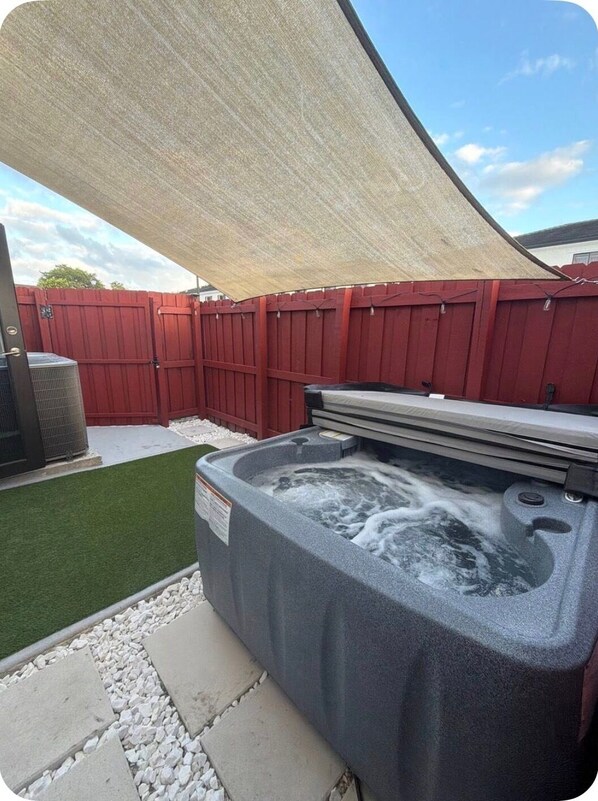 Step outside and enjoy the private, wood-gated patio—perfect for relaxing or spending time with your group. The highlight of the outdoor space is the jacuzzi, ideal for unwinding and enjoying peaceful evenings. After a long day, relax in the jacuzzi and enjoy the calm, private atmosphere. The jacuzzi area is designed for comfort and relaxation, making your stay even more memorable.