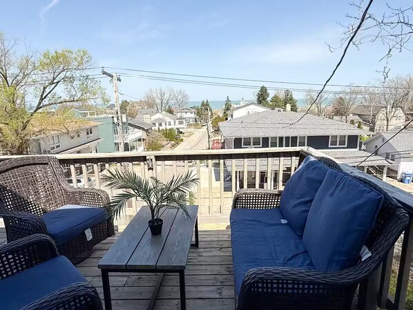 Charming 100-year-old beach cottage on Lake Shore Drive with stunning Lake Michigan views, wraparound deck, fire pit, HOT TUB (so cozy in the winter), and room for families or friends. Newly renovated with a breezy Hamptons vibe — steps from the beach!