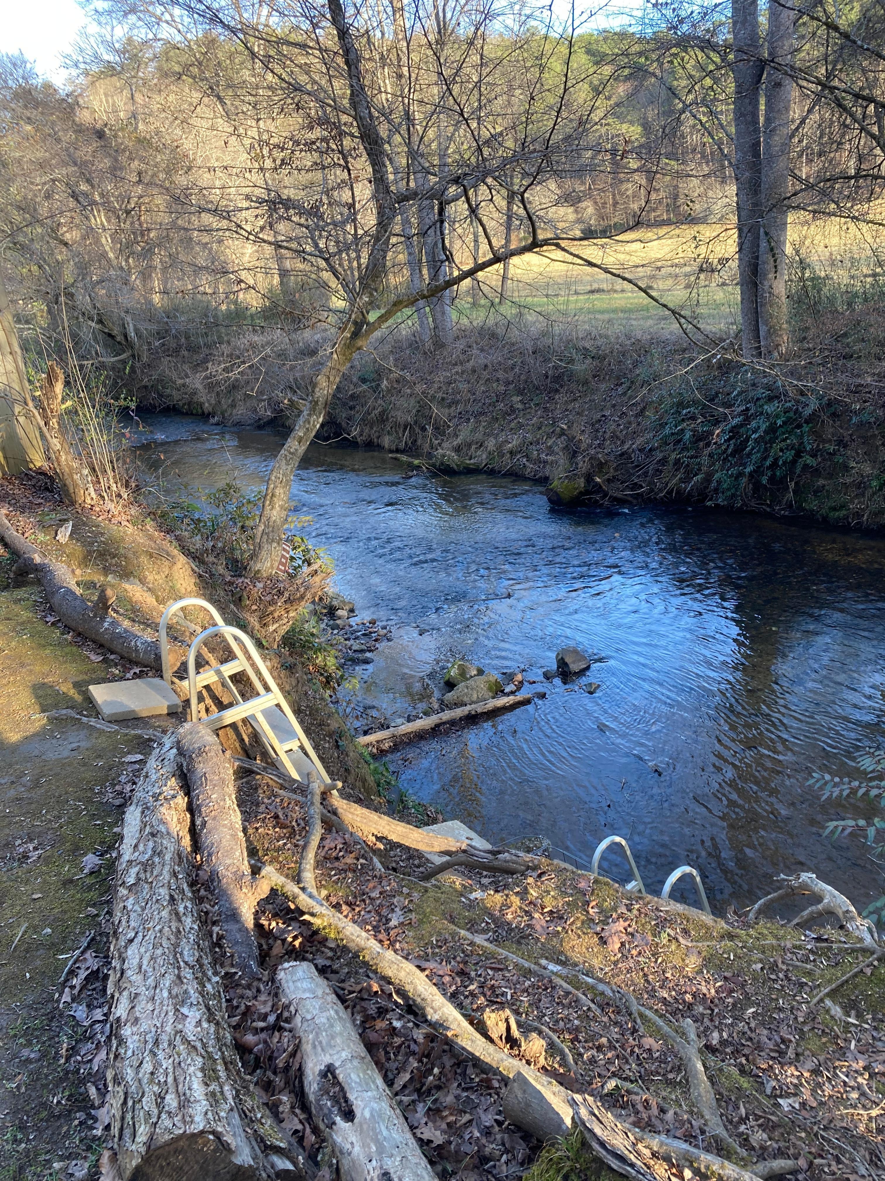 There is direct creek access. The bank is steep, so there are two 5-foot angled dock ladders with wide steps and handles. "There are new ladders to the creek that makes access easy" (Public Review).