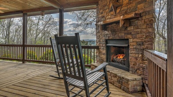 Extérieur - terrasse enveloppante au niveau principal, 6 chaises à bascule, balançoire de véranda, foyer au gaz en pierre avec manteau en bois, table de pique-nique en bois naturel, 6 sièges, ventilateurs de plafond; pont de niveau inférieur, sièges de spa 6, 4 chaises, table de bout, gril à gaz