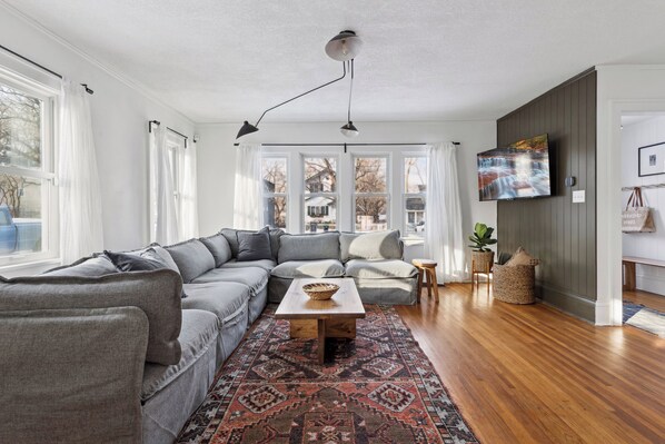 This beautifully remodeled 2,000 sq ft home in Linden Hills blends modern style with cozy cottage charm. Just blocks from 50th & France, Lake Harriet, and top dining spots, it’s the perfect getaway. With 3 bedrooms / 8 beds, 2 baths, and flexible sleeping arrangements for up to 10, enjoy hotel-quality linens, a fully stocked kitchen, sunroom coffee bar, SMART TVs on every level with Youtube TV and your favorite streaming apps, and family-friendly amenities. Relax, recharge, and explore from this prime location!