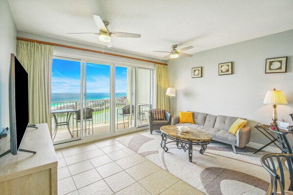 Enjoy all the amenities of the beautiful Seascape Resort and amazing views from this 19th floor condo at Ariel Dunes 2!  With views of the Choctawhatchee Bay and 18-hole golf course from the front door and spectacular views of the Emerald Coast and Stewart Lake from the back door you may never want to leave.  This newly remodeled 1 bedroom, 1.5 bath condo has it all and is perfect for the kids to have their own space.  This spacious floor plan has 9-foot tall ceilings with 8-foot tall sliding glass doors for ocean views from both the living room and master suite. This condo features one of the most convenient locations in Miramar Beach. This condo features a modern and freshly remodeled look perfect for a relaxing beach vacation! A very short walk to a private beach and you will be relaxing in the sand. This condo sleeps 6 with a master bedroom that has a queen size bed and two built in bunk beds in the hallway. There are LCD TVs in the master bedroom and living room. Condo comes with in unit washer/dryer, wifi, cable TV, and fitness room access.