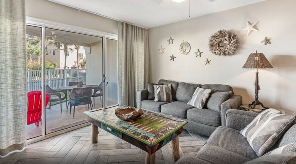 The master bedroom offers a king size bed and its own private bathroom and sliding glass doors that open to your oversized patio. The guest bedroom has a queen bed and is connected to the hall bath. The kids love the third bedroom and view it as their own little retreat while enjoying the bunk beds. The bottom bunk is a double-sized bed with the twin on the top. If you need additional sleeping space, no worries, the living area couch pulls out to a sleeper sofa.