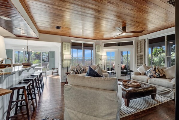 Experience the ultimate waterfront escape in this expansive 1,700 sq ft, three-bedroom, three-bathroom retreat designed to host up to 8 guests in comfort and style. Nestled in the heart of Sandestin Golf and Beach Resort, this home blends luxury and nature with pecky cypress ceilings, heart-of-pine flooring, and serene water views.