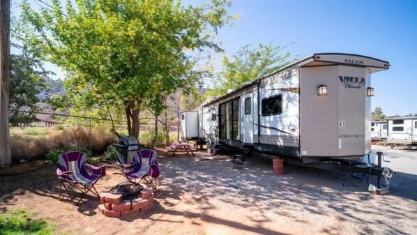 Profitez de l'expérience de camping et de plein air avec le confort du nouveau grand véhicule de camping 2018 situé dans le parc de camping OK avec branchement complet et connexion Wi-Fi. Barbecue à gaz avec table de pique-nique et foyer dans le parc pour Smores. Difficile de cuisiner dans les hôtels :-)