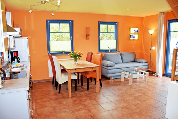 Bienvenue dans notre appartement à la maison côtière! Cet appartement affectueux et moderne (75 m², 4 personnes) est situé dans un duplex avec entrée indépendante. Le rez-de-chaussée dispose d'un coin salon et salle à manger avec cuisine moderne équipée, une table à manger avec des chaises et un canapé, moderne. Télévision à écran plat et radio. La cuisine moderne est entièrement équipée avec cuisinière, four, cafetière, grille-pain, bouilloire, lave-vaisselle et réfrigérateur. De la salle de séjour conduit à la terrasse avec salon de jardin et jardin commun. La chambre principale a l'étage un lit double confortable avec des tables de chevet et lampes de lecture. La deuxième chambre à l'étage deux lits simples avec tables de chevet et lampes de lecture. Cette chambre d'un lit. Un lit et une chaise haute sont à votre disposition sur demande. La belle salle de bain a une fenêtre, une douche, des toilettes et un lavabo. A votre arrivée, les lits sont bien sûr déjà recouvert de feuilles. Serviettes S'il vous plaît apporter.