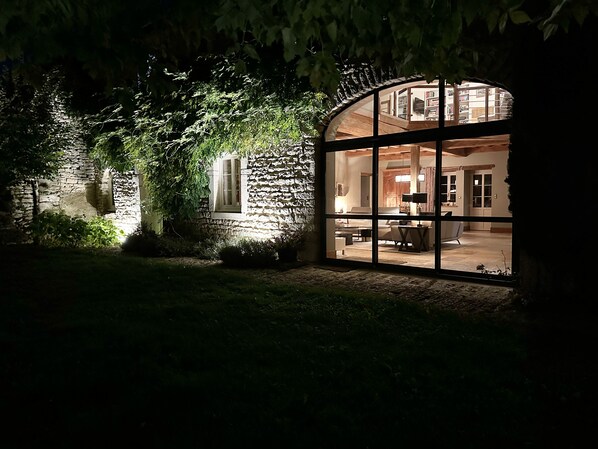 En arrivant, vous serez saisi par sa large façade de pierres apparentes et par son impressionnante ouverture arrondie anthracite de plus de 5m de haut et de large. Ce savant mélange d'ancien et de contemporain sera le leitmotiv de votre séjour. Un avant-goût exquis.
