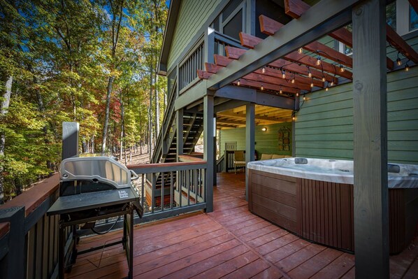 Outdoors, you'll find serenity at every turn. The screened-in living area is a highlight — complete with a wood-burning fireplace, Smart TV, and comfortable lounge seating for quiet mornings or cozy evenings spent fireside. Downstairs, the patio invites you to unwind in the bubbling six-person hot tub or grill dinner under the string lights. When the stars begin to shine, gather around the firepit patio for s'mores and stargazing surrounded by the gentle sounds of nature.