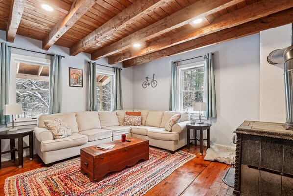 Elmore Meadows is a traditional country house with myriad elements and detail befitting the bucolic setting. Wide plank floors, a rich wood ceiling with handsome beams, and a wood-burning fireplace set the tone and the L-shaped couch in the living room invites you to kick back and relax after a day of exploration. The galley kitchen features an adjacent butler's pantry, and a gorgeous dining table encourages gathering for meals. Bright light, warm colorways, and artwork depicting the rural setting pervade throughout. Additional features on the main floor include a full bath, a laundry room and a rec room complete with foosball and a small library.
